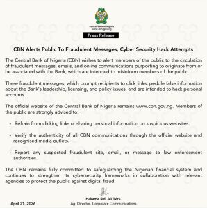 The Central Bank of Nigeria has stepped up efforts to combat cyber fraud, warning Nigerians about a surge in fake messages and online scams while reaffirming the resilience of the country’s financial system.