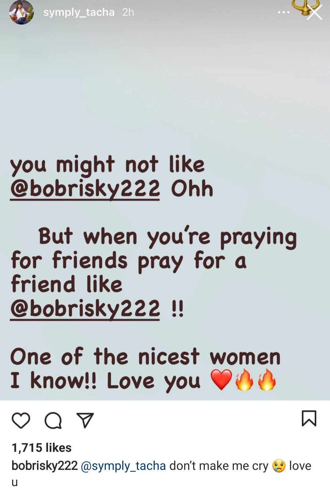 “Tacha don’t make me cry. Love u.”