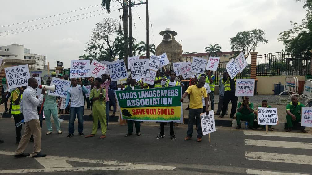 Workers of the Lagos Parks and Garden Agency [LASPARK] on Wednesday converge on the Lagos State House of Assembly [LAHA] to protest unpaid wages.