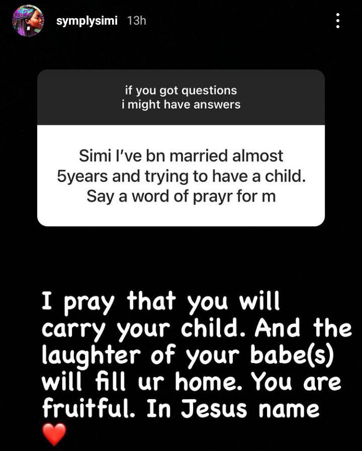 “Simi I’ve been married almost 5 years and trying to have a child, say a word of prayer for me”, the fan’s message reads.