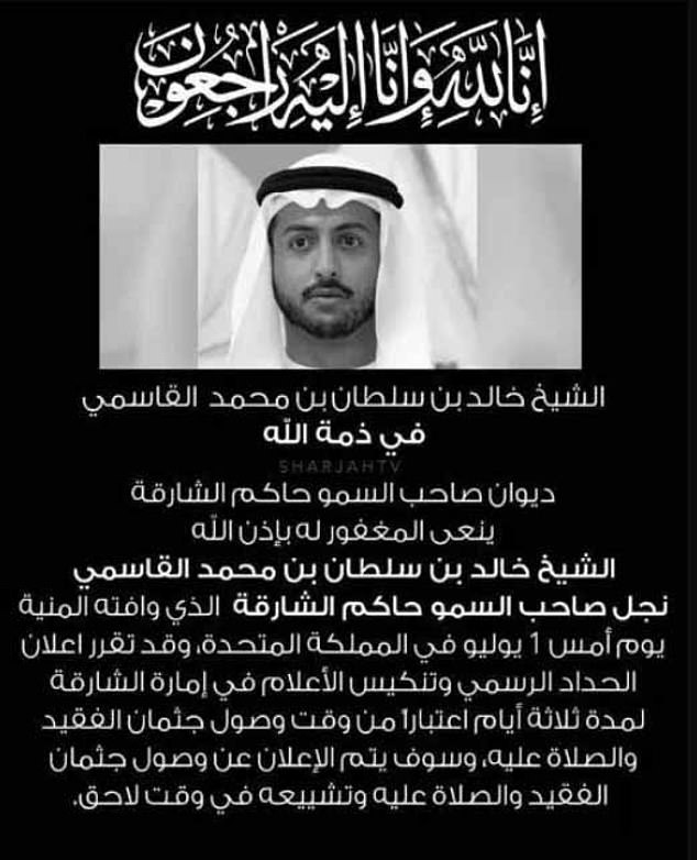 39-year-old son of Sharjah's ruler has died, it was revealed this afternoon that he…